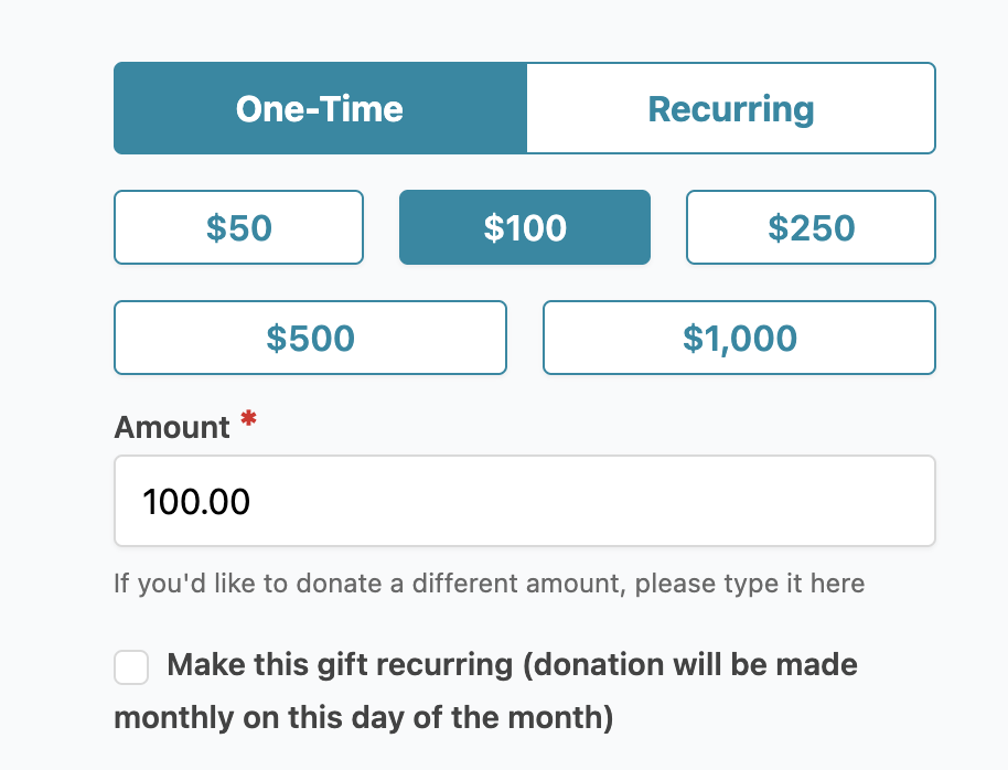 Select your type of donation. If making a monthly donation support, select “Recurring” or check the ” Make this gift recurring…“